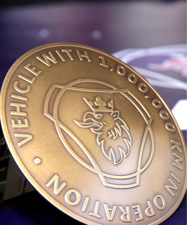 La Placa de 1 millón se entrega a aquellos clientes que han recorrido más de 1 millón de kms. con sus vehículos Scania, realizando sus mantenciones en los talleres Scania. Este reconocimiento que se instala en los camiones, es fabricado en Suecia, en el mismo lugar en el que hace el Premio Nobel.