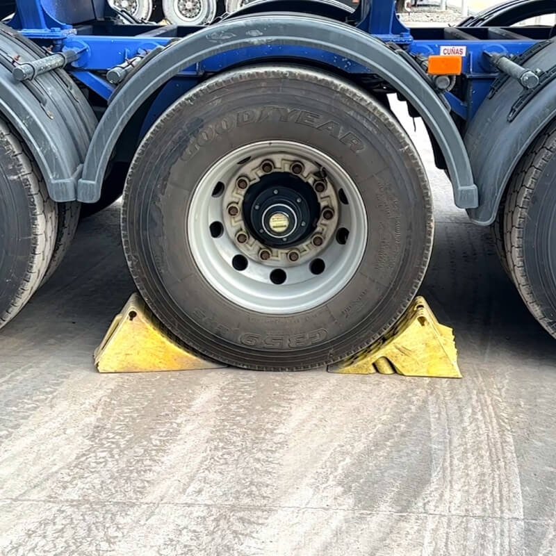 La utilización de cuñas en los neumáticos, para inmovilizar el camión de forma segura durante las maniobras de carga o descarga, es obligatorio. Se recomienda el uso de cuñas de poliuretano de alta resistencia o acero.